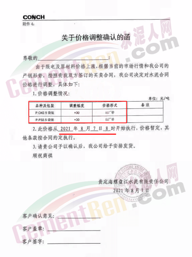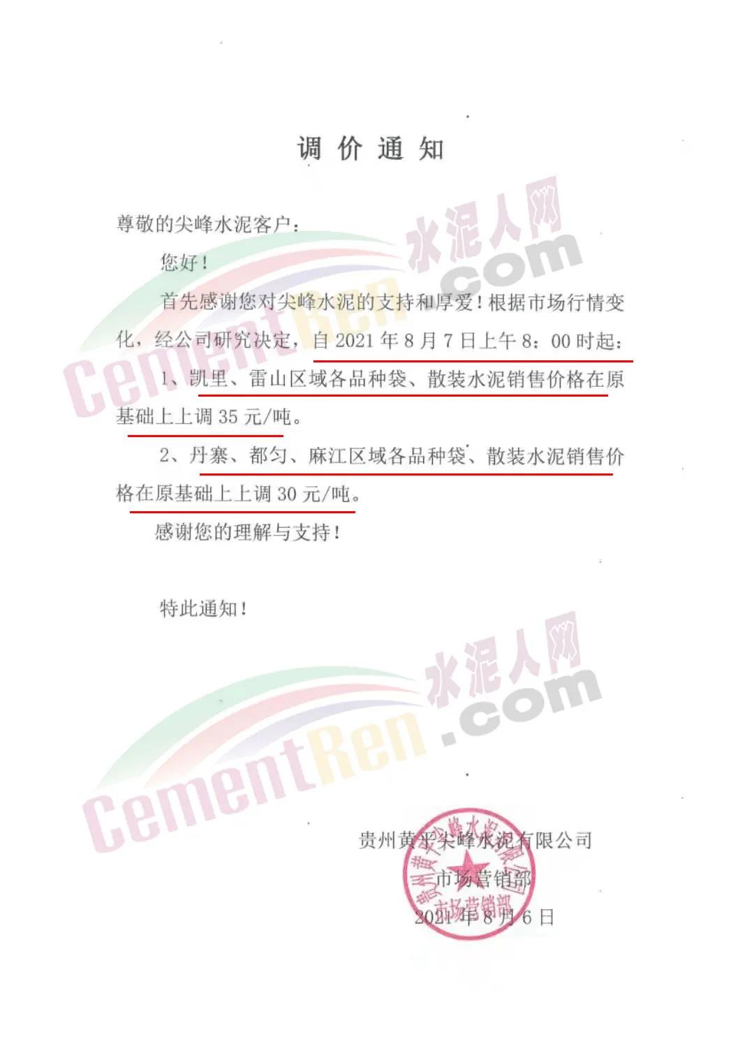 同日,企業(yè)又通知根據(jù)市場(chǎng)行情變化,經(jīng)公司研究決定,自2021年8月7日上午8時(shí)起,凱里、雷山區(qū)域各品種袋、散裝水泥銷售價(jià)格在原基礎(chǔ)上上調(diào)35元/噸;丹寨、都勻、麻江區(qū)域各品種袋、散裝水泥銷售價(jià)格在原基礎(chǔ)上上調(diào)30元/噸。