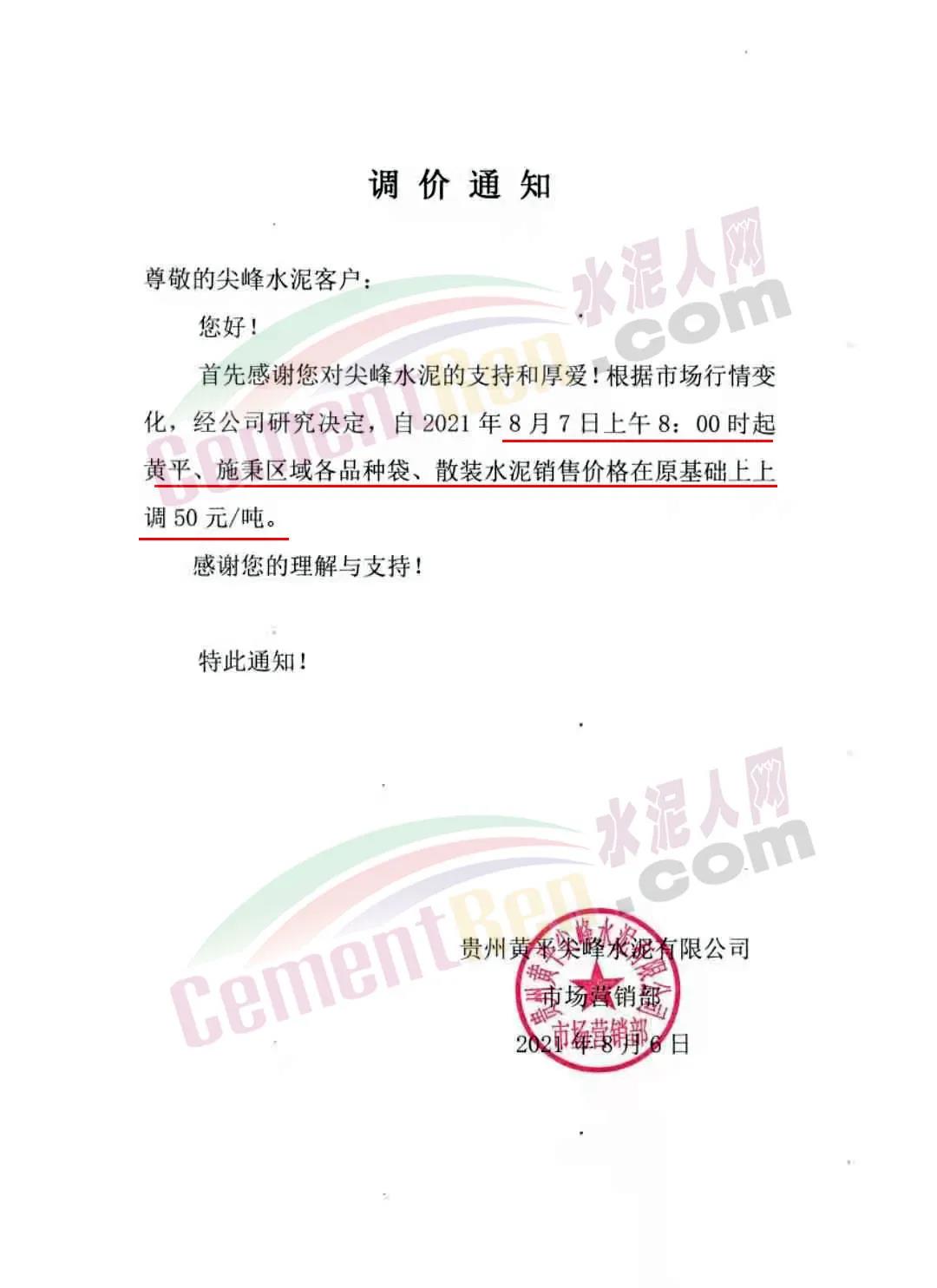 貴州黃平尖峰水泥有限公司市場(chǎng)營(yíng)銷部通知根據(jù)市場(chǎng)行情變化,經(jīng)公司研究決定,自2021年8月7日上午8時(shí)起黃平、施秉區(qū)域各品種袋、散裝水泥銷售價(jià)格在原基礎(chǔ)上上調(diào)50元/噸。