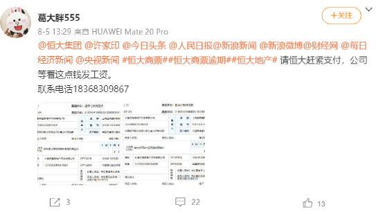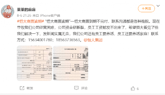 有網(wǎng)友在社交平臺(tái)上留言稱,恒大商票到期未付,令企業(yè)工資無法發(fā)出,被工人堵門,被逼賤賣機(jī)器設(shè)備。去年無奈收恒大商票,連云港恒大置業(yè),南京恒大富豐。今年到期,逾期卻遲遲不付,溝通幾個(gè)月基本無效。