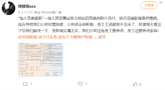 “恒大商票逾期,聯(lián)系溝通都是推脫,導(dǎo)致公司經(jīng)營(yíng)困難,公司資金鏈斷裂,員工工資發(fā)不出來了。”
