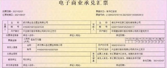 另一持票人爆料,一張出票人為奧山置業(yè)旗下子公司武漢奧山圣達(dá)置業(yè)有限公司的商票已于8月6日逾期尚未兌付。收票人為湖北中科宏泰工程機(jī)械有限公司,出票日期2021年2月7日,匯票到期日2021年8月7日,持票周期半年。票面金額50萬元。