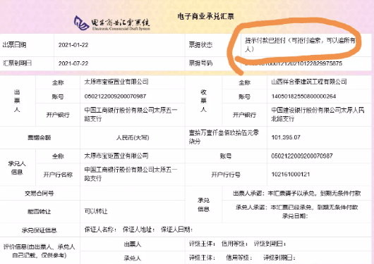 同時(shí),其還曬出了兩份商業(yè)承兌匯票的截圖,金額分別為40多萬和10多萬,出票人均顯示為太原市寶鉅置業(yè)有限公司,出票時(shí)間為2021年1月22日,到期日為2021年7月22日。票據(jù)狀態(tài)為“提示付款已拒付”。