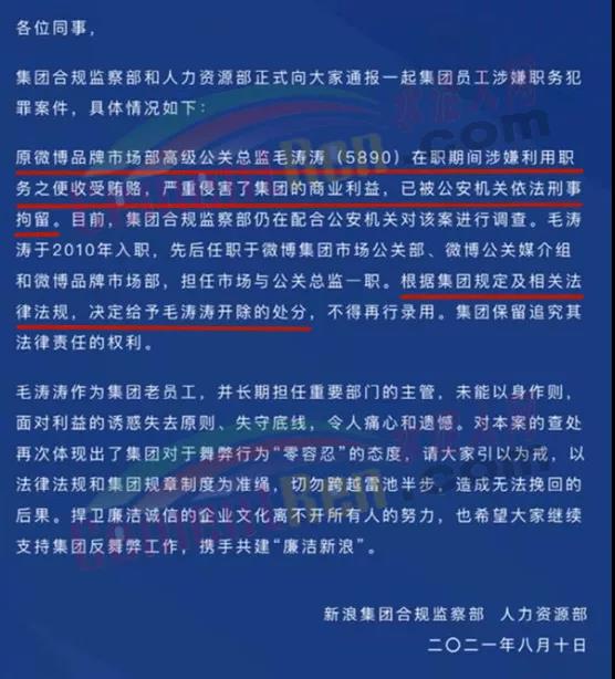 日前,新浪集團(tuán)合規(guī)監(jiān)察部人力資源部發(fā)布內(nèi)部通報(bào),稱公司品牌市場(chǎng)部高級(jí)公關(guān)總監(jiān)毛濤濤在職期間涉嫌利用職務(wù)之便收受賄賂,嚴(yán)重侵害了集團(tuán)的商業(yè)利益,現(xiàn)已被公安機(jī)關(guān)依法刑事拘留。