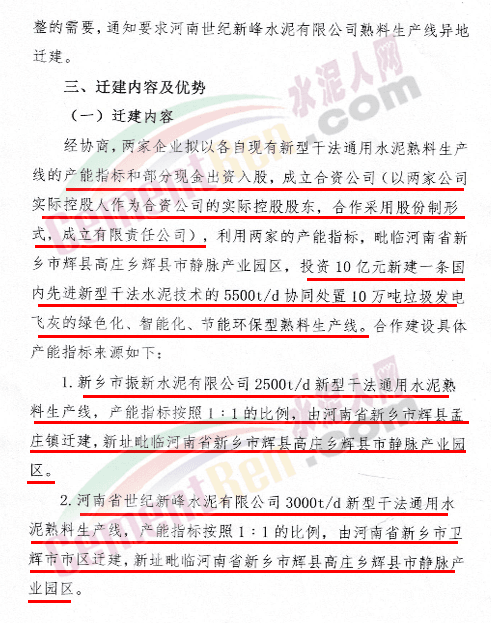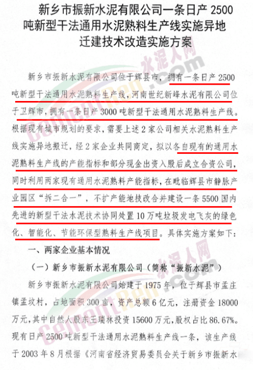 公示文件提到,新鄉(xiāng)市振新水泥有限公司與河南世紀新峰水泥有限公司擬投資10億元,以各自現(xiàn)有的通用水熟料生產(chǎn)線的產(chǎn)能指標和部分現(xiàn)金出資入股后成立合資公司,同時利用兩家現(xiàn)有通用水泥熟料產(chǎn)能指標,在毗臨輝縣市靜脈產(chǎn)業(yè)園區(qū)“拆二合一”,不擴產(chǎn)能地技改合并建設(shè)一條5500t/d國內(nèi)先進的新型干法水泥技術(shù)協(xié)同處置10萬噸垃圾發(fā)電飛灰的綠色化、智能化、節(jié)能環(huán)保型熟料生產(chǎn)線項目。
