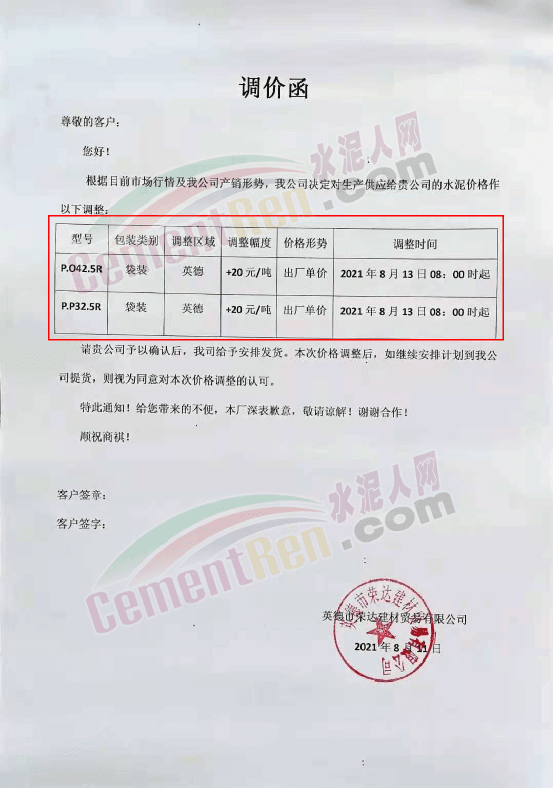 同期,水泥價格也出現(xiàn)跟漲。8月12日四川億鑫聯(lián)水泥有限公司通知,由于當(dāng)前市場變化情況,經(jīng)公司研究決定,自8月13日旱上7時起,對公司袋裝、散裝水泥在原價格基礎(chǔ)上上調(diào)50元/噸。價格調(diào)整后,如您繼續(xù)安排車輛到公司提貨,則視為確認(rèn)本次價格調(diào)整。
