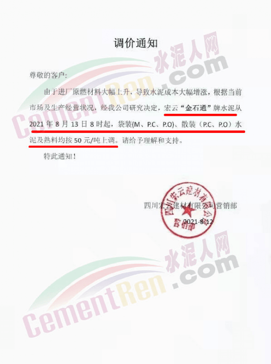 四川宏云建材有限公司營銷部通知由于進(jìn)廠原燃材料大幅上升,導(dǎo)致水泥成本大幅增漲,根據(jù)當(dāng)前市場及生產(chǎn)經(jīng)營狀況,經(jīng)公司研究決定,宏云“金石通”牌水泥從8月13日8時起,袋裝(M、P.C、P.O)、散裝(P.C、P.O)水泥及熟料均按50元/噸上調(diào)。