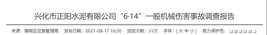 經(jīng)調(diào)查認(rèn)定,興化市正陽(yáng)水泥有限公司“6.14”一般機(jī)械傷害事故是一起生產(chǎn)安全責(zé)任事故。