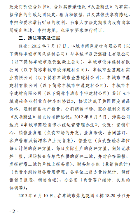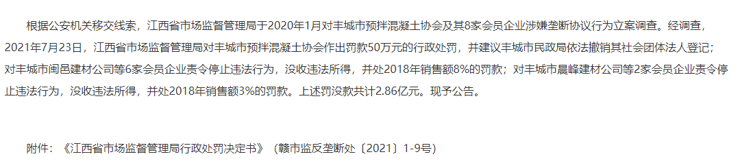 經(jīng)調(diào)查,2021年7月23日,江西省市場監(jiān)督管理局對豐城市預拌混凝土協(xié)會作出罰款50萬元的行政處罰,并建議豐城市民政局依法撤銷其社會團體法人登記;對豐城市閩邑建材公司等6家會員企業(yè)責令停止違法行為,沒收違法所得,并處2018年銷售額8%的罰款;對豐城市晨峰建材公司等2家會員企業(yè)責令停止違法行為,沒收違法所得,并處2018年銷售額3%的罰款。上述罰沒款共計2.86億元。