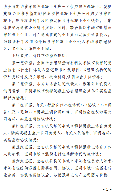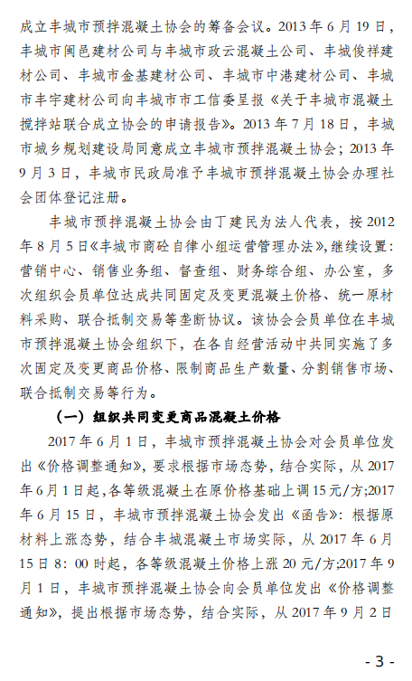 日前,江西省市場監(jiān)管局發(fā)布《豐城市預拌混凝土協(xié)會及其會員企業(yè)壟斷協(xié)議案的處罰決定》根據(jù)公安機關移交線索,江西省市場監(jiān)督管理局于2020年1月對豐城市預拌混凝土協(xié)會及其8家會員企業(yè)涉嫌壟斷協(xié)議行為立案調(diào)查。