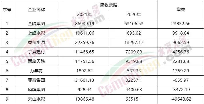 從近期水泥板塊上市企業(yè)發(fā)布的中報數(shù)據(jù)來看,9家上市公司有6家企業(yè)應(yīng)收票據(jù)金額較上年同期有所增加,其中金隅集團(tuán)2021年中報應(yīng)收票近8.7億,同比2020年中報增長約2.4億,上峰水泥2021年中報應(yīng)收票約1.1億,上年中報應(yīng)收票僅693.02億,應(yīng)收票據(jù)增加近1億元。以水泥為主業(yè),曾經(jīng)的“巨虧”冀東水泥應(yīng)收票據(jù)增長9062.59萬元。