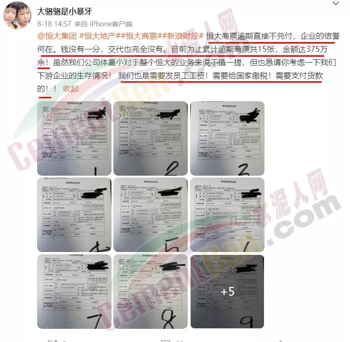日前,網(wǎng)友“搬磚美少女1225”在社交平臺發(fā)布消息稱“我公司因業(yè)務(wù)往來收到由恒大地產(chǎn)集團(tuán)簽發(fā)和承兌的銀行承兌匯票,作為票據(jù)權(quán)益合法持有人,按照《票據(jù)法》約定的到期提示付款,要求承兌人無條件進(jìn)行兌付,結(jié)果遲遲不付款。工人等著工資寄回家,都上有老下有小,孩子即將開學(xué)也要支付學(xué)費等等…小微企業(yè)實在拖不起了”。