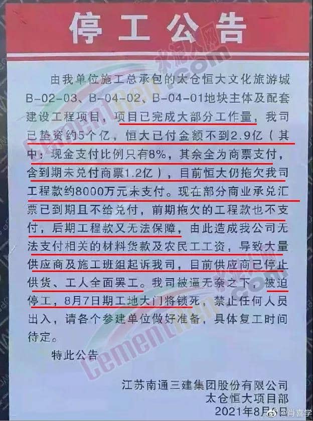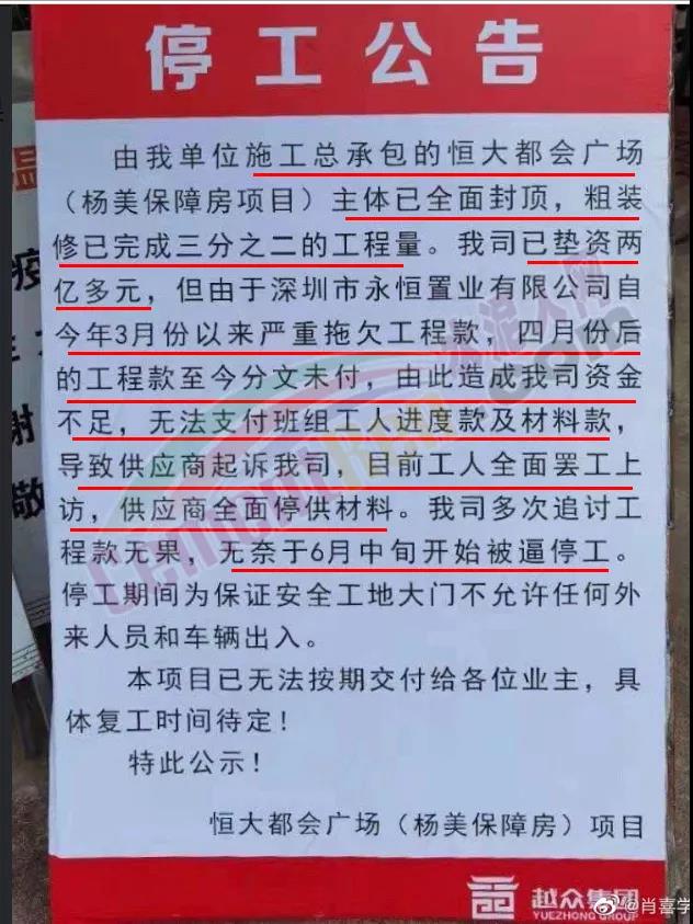 材料供應(yīng)商表示已暫停向恒大集團(tuán)及其成員企業(yè)供貨