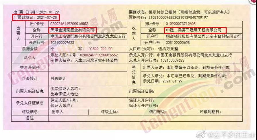 不僅恒大,另一名為“差不多的王sir”發(fā)消息稱“實地地產(chǎn)集團(tuán)開出的商業(yè)承兌匯票到期也開始拒付不予供應(yīng)商付款了。近期有朋友發(fā)來實地地產(chǎn)集團(tuán)的子公司天津金河灣置業(yè)開出的商業(yè)承兌,到期將近一個月時間,竟然還不予解付。不知道是實地地產(chǎn)集團(tuán)近期有變動還是和廣州某大地產(chǎn)一樣資金出現(xiàn)嚴(yán)重問題了。希望實地地產(chǎn)集團(tuán)早日處理解決問題。”