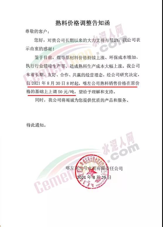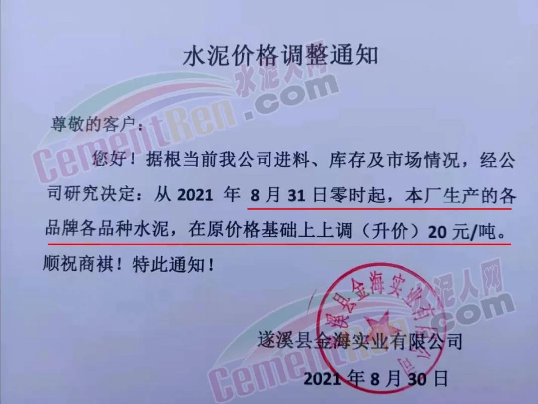 同日,廣東省湛江市遂溪縣金海實(shí)業(yè)有限公司通知,據(jù)根當(dāng)前公司進(jìn)料、庫存及市場(chǎng)情況,經(jīng)研究決定從2021年8月31日零時(shí)起,本廠生產(chǎn)的各品牌各品種水泥,在原價(jià)格基礎(chǔ)上上調(diào)20元/噸。