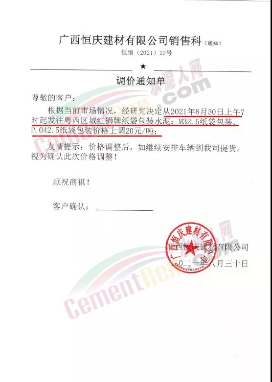 廣西恒慶建材有限公司銷售科通知根據(jù)當(dāng)前市場(chǎng)情況,經(jīng)研究決定從2021年8月30日上午7時(shí)起發(fā)往粵西區(qū)域紅獅牌紙袋包裝水泥,M32.5紙袋包裝、P.042.5紙袋包裝價(jià)格上調(diào)20元/噸。