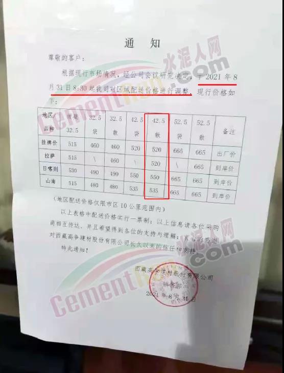 西藏高爭(zhēng)建材股份有限公司通知8月31日8時(shí)起公司對(duì)區(qū)域配送價(jià)格進(jìn)行調(diào)整。調(diào)整后P.O42.5散裝水泥出廠掛牌價(jià)520元/噸,到位價(jià)拉薩市場(chǎng)執(zhí)行520元/噸,日喀則市場(chǎng)執(zhí)行550元/噸,山南市場(chǎng)執(zhí)行535元/噸,地區(qū)配送價(jià)格僅限市區(qū)10公里范圍內(nèi)。