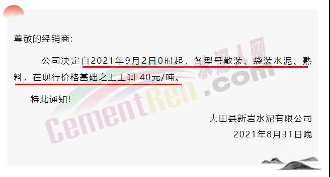 大田縣新巖水泥有限公司通知稱,公司決定自2021年9月2日0時(shí)起,各型號(hào)散裝、袋裝水泥、熟料,在現(xiàn)行價(jià)格基礎(chǔ)之上上調(diào) 40元/噸。