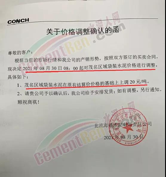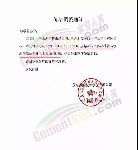 茂名市油城牌水泥有限公司通知,由于水泥銷售市場(chǎng)原因,結(jié)合公司的生產(chǎn)及銷售實(shí)際情況,本公司決定從2021年8月30日零時(shí)起對(duì)各品種袋裝水泥在原價(jià)基礎(chǔ)上上調(diào)20元/噸。