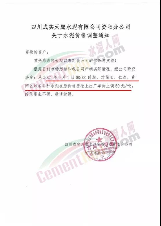 四川成實(shí)天鷹水泥有限公司資陽分公司通知根據(jù)目前市場(chǎng)形勢(shì)和公司產(chǎn)銷實(shí)際情況,經(jīng)公司研究決定從2021年9月1日8時(shí)起,對(duì)簡(jiǎn)陽、仁壽、資陽區(qū)域各品種水泥在原價(jià)格基礎(chǔ)上出廠單價(jià)上調(diào)50元/噸。