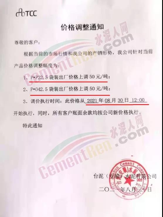 臺(tái)泥(安順)水泥通知根據(jù)當(dāng)前的市場(chǎng)行情和公司的產(chǎn)銷形勢(shì),從8月30日12時(shí)開始P.P32.5袋裝出廠價(jià)格上調(diào)50元/噸;P.042.5袋裝出廠價(jià)格上調(diào)50元/噸。