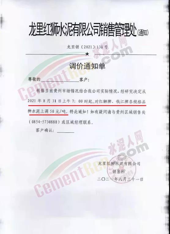龍里紅獅水有限公司通知,根據(jù)當(dāng)前貴州市場(chǎng)情況結(jié)合公司實(shí)際情況,經(jīng)研究決定從2021年8月31日上午7時(shí)起,對(duì)紅獅牌、錢江牌各規(guī)格品種水泥上調(diào)50元/噸。