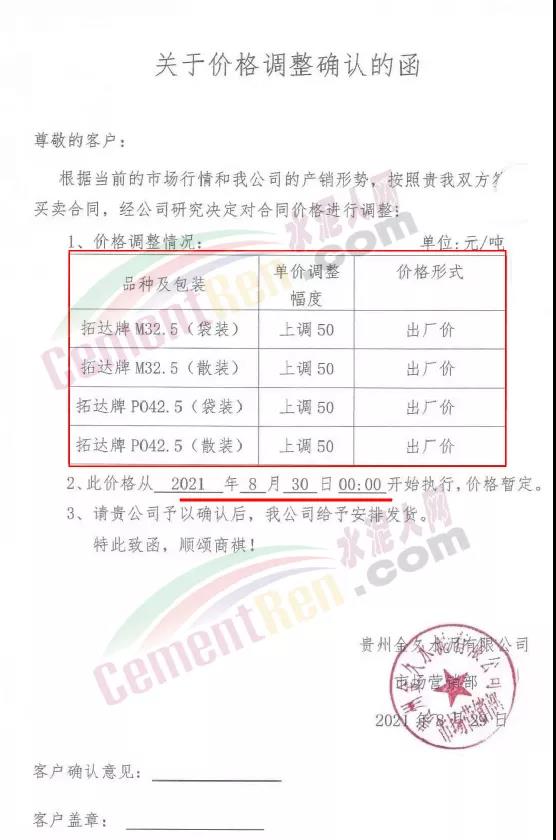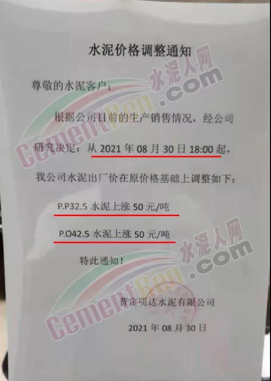 貴州省安順市普定縣普定明達(dá)水泥有限公司通知根據(jù)公司目前的生產(chǎn)銷售情況,經(jīng)公司研究決定從2021年8月30日18時(shí)起,公司水泥出廠價(jià)在原價(jià)格基礎(chǔ)上P.P32.5水泥上漲50元/噸,P.O42.5水泥上漲50元/噸。