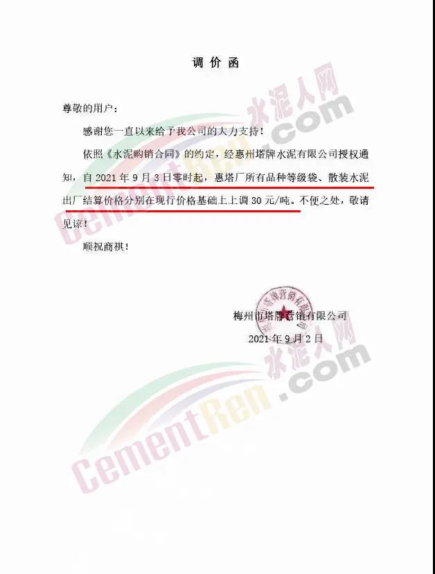 梅州塔牌營(yíng)銷(xiāo)有限公司通知,依照《水泥購(gòu)銷(xiāo)合同》的約定,經(jīng)惠州塔牌水泥有限公司授權(quán)通知,自2021年9月3日零時(shí)起,惠塔廠所有品種等級(jí)袋、散裝水泥出廠結(jié)算價(jià)格分別在現(xiàn)行價(jià)格基礎(chǔ)上上調(diào)30元/噸。
