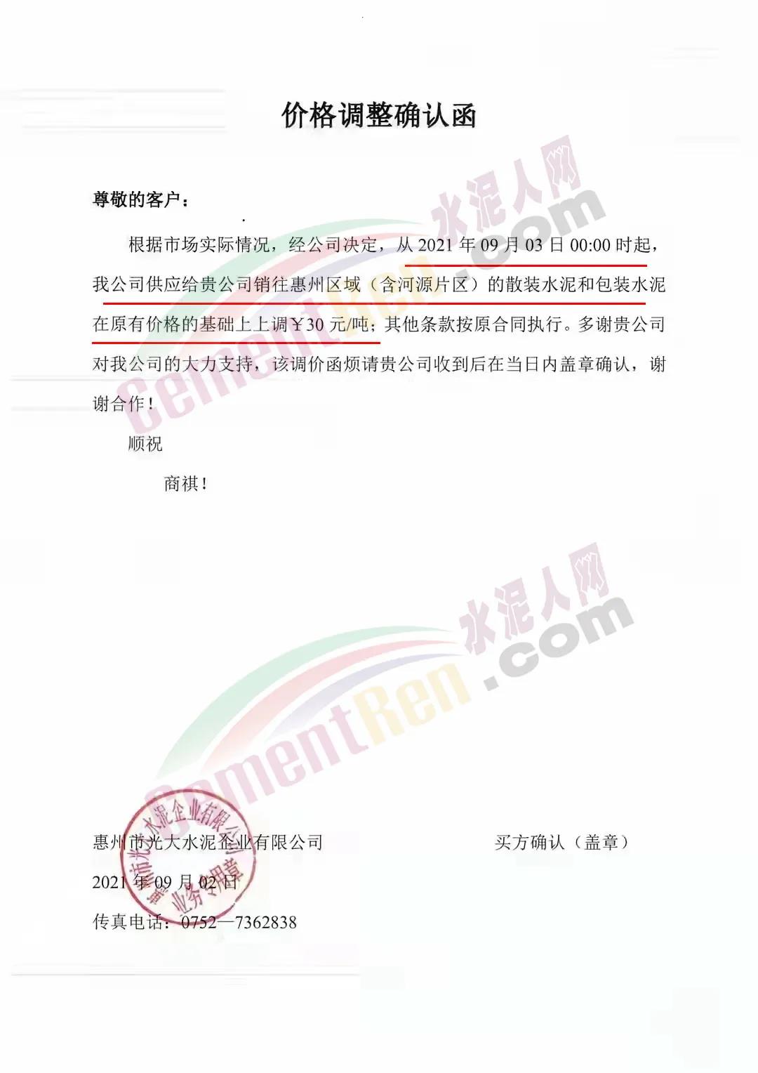 惠州市光大水泥企業(yè)有限公司通知,從2021年9月3日0時(shí)起,公司銷(xiāo)往惠州區(qū)域(含河源片區(qū))的散裝水泥和包裝水泥在原有價(jià)格的基礎(chǔ)上上調(diào)30元/噸。