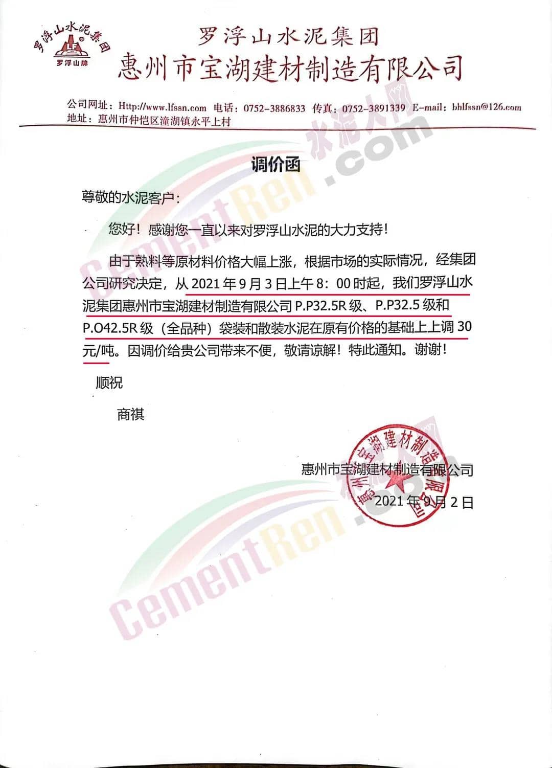 羅浮山水泥集團(tuán)惠州市寶湖建材制造有限公司通知,由于熟料等原材料價(jià)格大幅上漲,經(jīng)集團(tuán)公司研究決定,從2021年9月3日上午8時(shí)起,羅浮山水泥集團(tuán)惠州市寶湖建材制造有限公司P.P32.5R級(jí)、P.P32.5級(jí)和P.O42.5R級(jí)(全品種)袋裝和散裝水泥在原有價(jià)格的基礎(chǔ)上上調(diào)30元/噸。