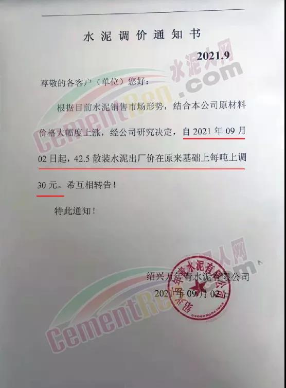 由于受各種原材料價(jià)格上升的影響,公司根據(jù)目前水泥的市場(chǎng)行情,經(jīng)研究決定從2021年9月2日下午18時(shí)起,公司供應(yīng)的PP32.5R包裝、散裝在原價(jià)的基礎(chǔ)上上調(diào)10元/噸。PO42.5R散裝在原價(jià)的基礎(chǔ)上上調(diào)10元/噸。