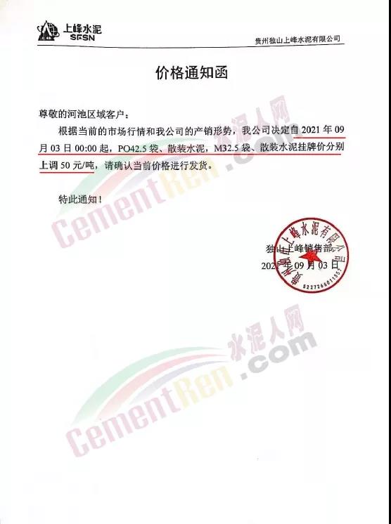 貴州獨(dú)山上峰水泥有限公司通知,根據(jù)當(dāng)前的市場(chǎng)行情和公司的產(chǎn)銷(xiāo)形勢(shì),公司決定自2021年9月3日0時(shí)起,PO42.5袋、散裝水泥,M32.5袋、散裝水泥掛牌價(jià)分別上調(diào)50元/噸。
