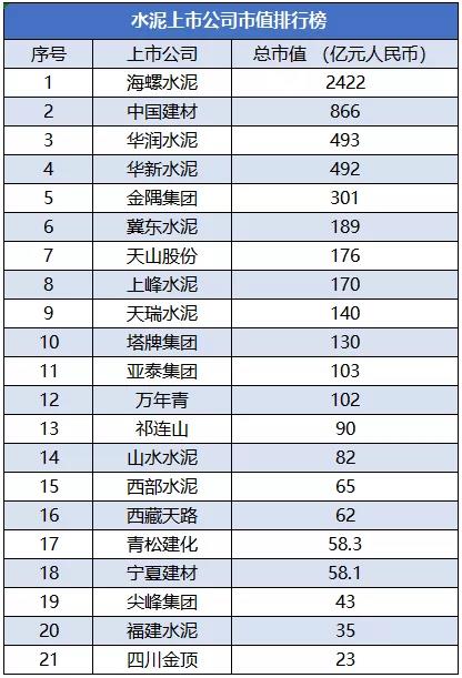 從上述榜單來看,截至9月6日晚間收盤時(shí),總市值超過1000億的水泥企業(yè)只有一家——海螺水泥。而排名前五的水泥企業(yè)分別是:海螺水泥2422億、中國建材866億、華潤水泥493億、華新水泥492億、金隅集團(tuán)401億。