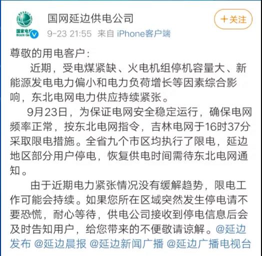 由于近期省內(nèi)電煤緊張,導(dǎo)致吉林省各發(fā)電廠發(fā)電供應(yīng)不足,電網(wǎng)運(yùn)行受到影響。根據(jù)吉林省能源局(吉能電力【2021】275號(hào))文件統(tǒng)一部署,為保證電網(wǎng)安全運(yùn)行,上級(jí)電力調(diào)度部門隨時(shí)可能下達(dá)停電、限電指令。由于情況緊急不能提前通知。