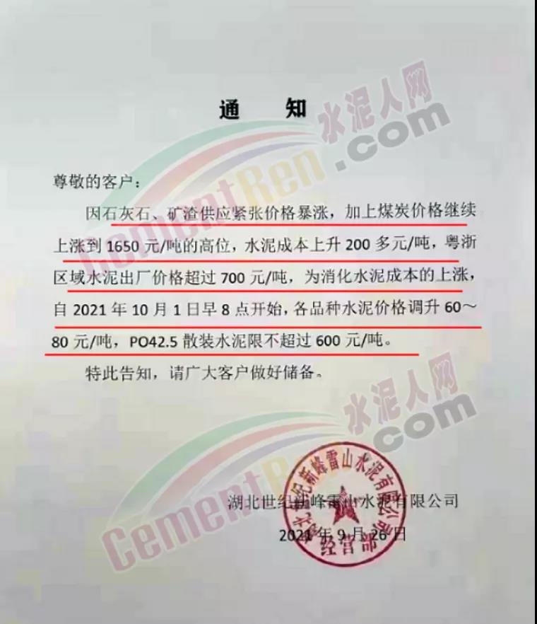 日前,湖北世紀新峰雷山水泥通知稱,因石灰石、礦渣供應(yīng)緊張價格暴漲,加上煤炭價格繼續(xù)上漲到1650元/噸的高位,水泥成本上升200多元/噸,粵浙區(qū)域水泥出廠價格超過700元/噸。為消化水泥成本的上漲,自2021年10月1日早8點開始,各品種水泥價格調(diào)升60~80元/噸,PO42.5散裝水泥限不超過600元/噸。