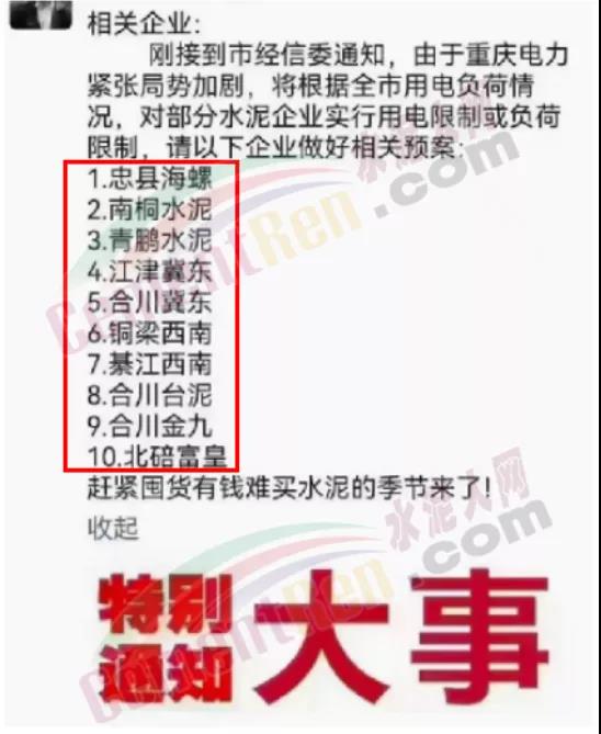 最近一則通知消息,在重慶地區(qū)水泥行業(yè)里熱傳,水泥銷售紛紛提示客戶趕緊囤貨有錢難買水泥的季節(jié)來了。消息稱:剛接到市經(jīng)信委通知,由于重慶電力緊張局勢加劇,將根據(jù)全市用電負荷情況,對部分水泥企業(yè)實行用電限制或負荷限制,涉及忠縣海螺、南桐水泥、青鵬水泥、江津冀東、合川冀東、銅梁西南、綦江西南、合川臺泥、合川金九、北碎富皇10家水泥企業(yè)。