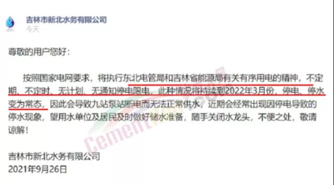 吉林市新北水務(wù)有限公司2021年9月26日發(fā)布公告稱,按照國家電網(wǎng)要求,將執(zhí)行東北電管局和吉林省能源局有關(guān)有序用電的精神,不定期、不定時、無計劃、無通知停電限電,此種情況將持續(xù)到2022年3月份,停電、停水變?yōu)槌B(tài),因此會導(dǎo)致九站泵站斷電而無法正常供水,近期會經(jīng)常出現(xiàn)因停電導(dǎo)致的停水現(xiàn)象,望用水單位及居民及時做好儲水準(zhǔn)備,隨手關(guān)閉水龍頭,不便之處,敬請諒解!