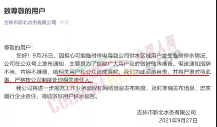 據(jù)了解目前該公司已經(jīng)刪除上述通知。并于9月27日,吉林市新北水務(wù)有限公司在其微信公眾號發(fā)布公告:9月26日,因擔(dān)心可能臨時停電導(dǎo)致公司供水區(qū)域用戶發(fā)生臨時停水情況稱,公司在公眾號上發(fā)布通知,主要是為了提醒廣大用戶及時做好儲水準(zhǔn)備。但該通知措辭不當(dāng)、內(nèi)容不準(zhǔn)確,給相關(guān)用戶和公眾造成誤解。我們?yōu)榇松罡凶载?zé),并將嚴肅對待此事,嚴格按公司制度處理相關(guān)責(zé)任人。公司將進一步規(guī)范工作業(yè)務(wù)流程和網(wǎng)絡(luò)信息發(fā)布制度,及時準(zhǔn)確發(fā)布信息,忠實履行企業(yè)責(zé)任,竭誠做好用戶供水服務(wù)。