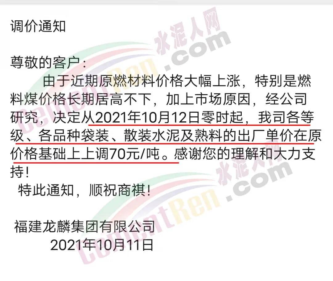 福建龍麟集團有限公司通知,由于近期原燃材料價格大幅上漲,特別是燃料煤價格長期居高不下,加上市場原因,經(jīng)公司研究,決定從2021年10月12日零時起,公司各等級、各品種袋裝、散裝水泥及熟料的出廠單價在原價格基礎(chǔ)上上調(diào)70元/噸。