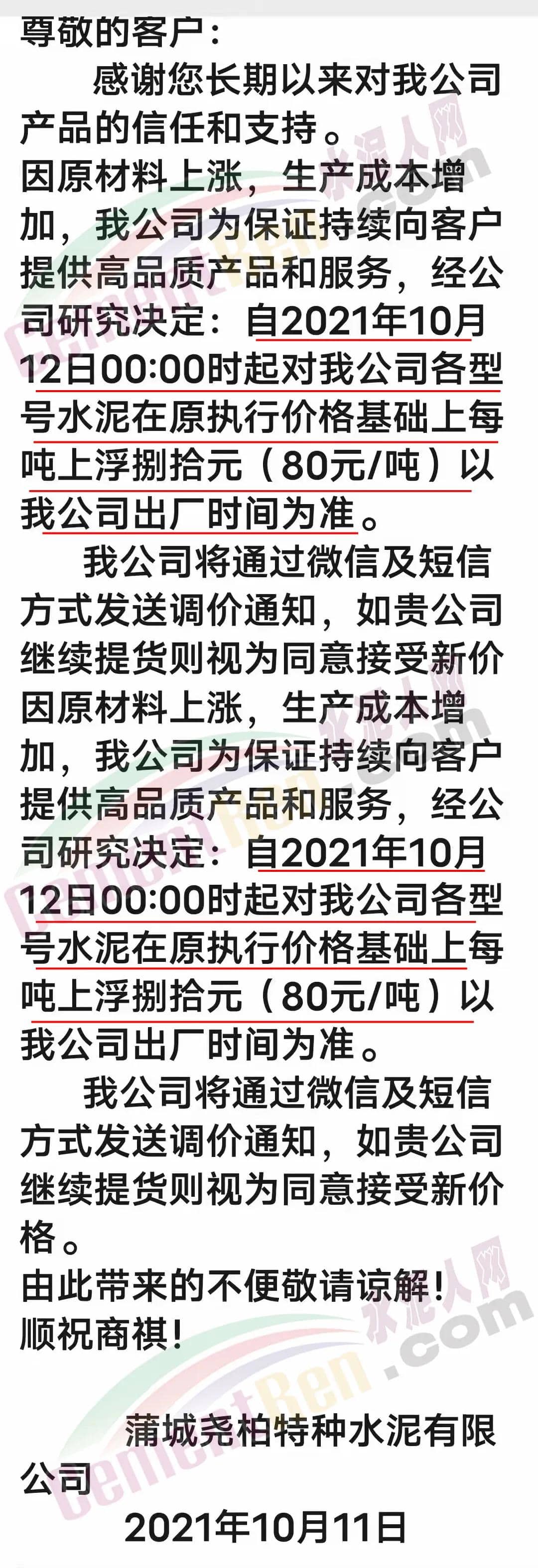 蒲城堯柏特種水泥有限公司通知,因原材料上漲,生產(chǎn)成本增加,公司為保證持續(xù)向客戶提供高品質(zhì)產(chǎn)品和服務(wù),經(jīng)公司研究決定,自2021年10月12日0時起對公司各型號水泥在原執(zhí)行價格基礎(chǔ)上上浮80元/噸。