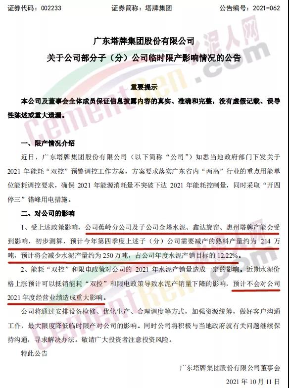 10月11日塔牌集團(tuán)稱,近日,廣東塔牌集團(tuán)股份有限公司知悉當(dāng)?shù)卣块T下發(fā)關(guān)于2021 年能耗“雙控”預(yù)警調(diào)控工作方案,方案要求落實(shí)廣東省內(nèi)“兩高”行業(yè)的重點(diǎn)用能單位能耗調(diào)控要求,確保2021年能源消耗量不突破下達(dá)2021年能耗控制量,同時(shí)采取“開四停三”錯(cuò)峰用電措施。