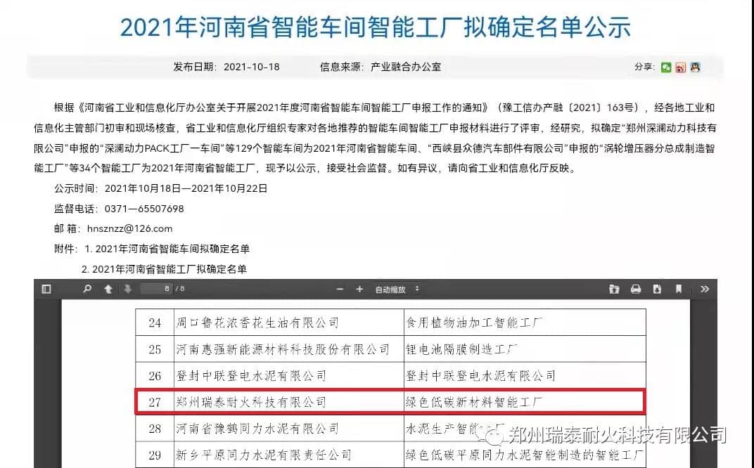 10月18日,河南省工業(yè)和信息化廳發(fā)布了2021年河南省“智能工廠”評審結(jié)果名單,鄭州瑞泰耐火科技有限公司通過認定,標志著鄭州瑞泰智能生產(chǎn)制造邁上了新臺階,實現(xiàn)了新突破。