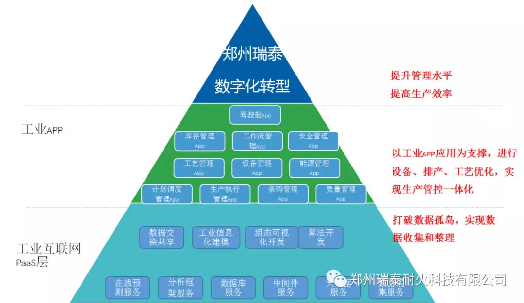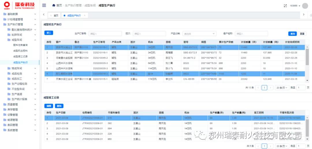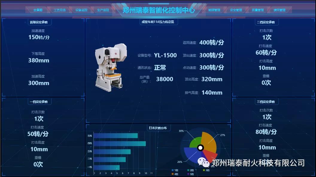 目前,鄭州瑞泰實現(xiàn)了耐火材料制造過程中的全部數(shù)字化管理與控制,包括生產(chǎn)計劃、作業(yè)派工、庫存等管理以及設(shè)備聯(lián)網(wǎng)、數(shù)據(jù)自動實時采集、工業(yè)大數(shù)據(jù)分析和現(xiàn)場看板化展示等。在生產(chǎn)過程中,從粉碎、配料、成型、燒成、檢測、包裝流程全面實現(xiàn)自動化、數(shù)字化、網(wǎng)絡(luò)化、智能化。