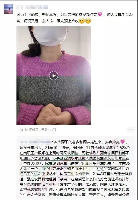 日前,網(wǎng)友“無助小丫頭”發(fā)布消息稱“2021年10月19號,溧陽市“江蘇金峰水泥集團(tuán)”52歲的在崗職工盧銀順在上班時(shí)間又被犧牲,死壯(狀)慘烈!死者家屬目前都不知道具體怎么死的、涉事企業(yè)騙取家屬到人民醫(yī)院急診又告知家屬在七里崗火化場,家屬見到死者也是在火化場太平間凍起來了、年前35天死了三個(gè)。21年5月至今為建金峰廊道、強(qiáng)迫農(nóng)民耕地租賃千余畝,這背后是什么樣的勢力能讓沒有排除安全隱患的血淚企業(yè)能正常生產(chǎn)至今的,同是天涯淪落人,希望死者家屬能挺住,也再次希望政府部門能重視金峰水泥長久以來的生產(chǎn)安全問題,嚴(yán)肅處理實(shí)際控制人等一幫責(zé)任人,換(還)受害者公道。”