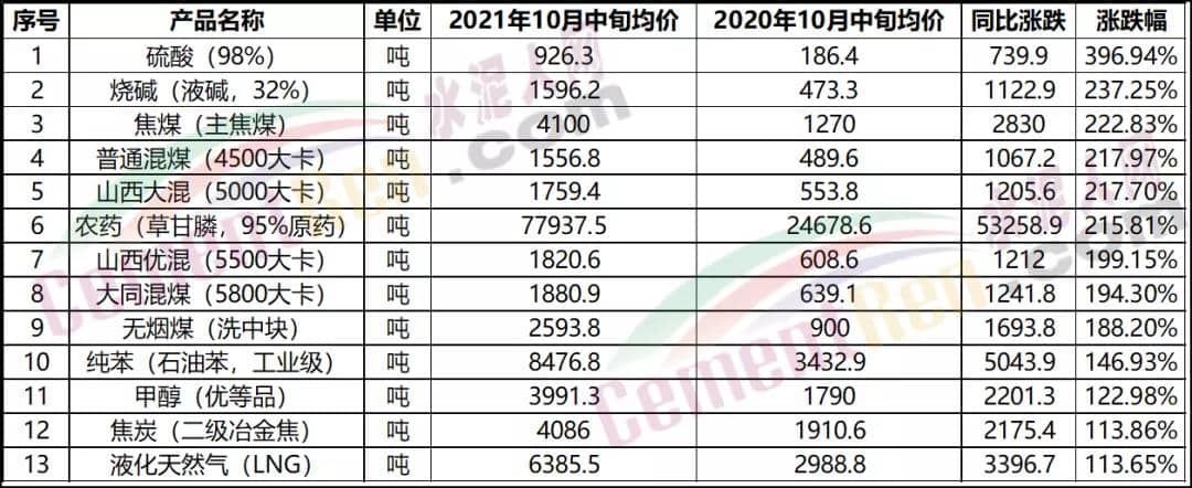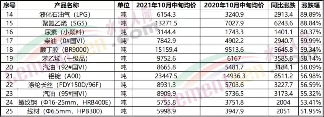據(jù)國家統(tǒng)計局官網(wǎng)公布的全國流通領(lǐng)域9大類50種重要生產(chǎn)資料市場價格的監(jiān)測數(shù)據(jù)顯示,2021年10月中旬同比2020年10月中旬47種產(chǎn)品價格上漲,3種下降。其中13種產(chǎn)品漲幅在100%以上,12種產(chǎn)品漲幅在50%~90%之間。