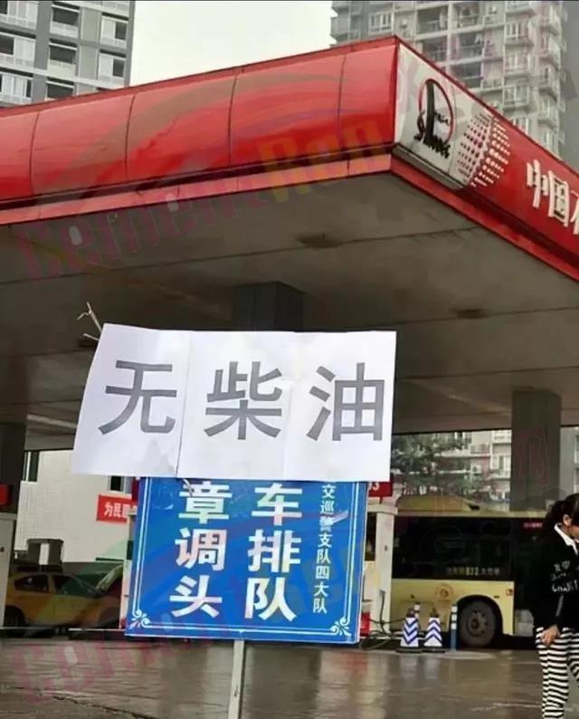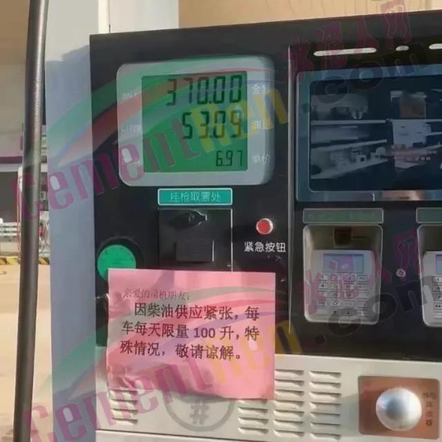 從圖片中可以看出,在加油站油箱上,醒目的貼上“因柴油價格供應(yīng)緊張,每車每天限量100升,特殊情況,敬請諒解”。