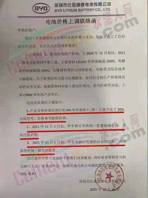 近日比亞迪發(fā)布通知稱,由于市場變化、疊加限電限產(chǎn)影響,與2020年12月相比,2021年鋰電池原材料不斷上漲,正極材料LiCoO2價格漲幅超200%,電解液價格漲幅超150%,負(fù)極材料等供應(yīng)持續(xù)緊張,導(dǎo)致綜合成本大幅提高。根據(jù)原材料價格上漲實際情況,深圳市比亞迪鋰電池有限公司經(jīng)研究決定,上調(diào)CO8M等電池產(chǎn)品單價。