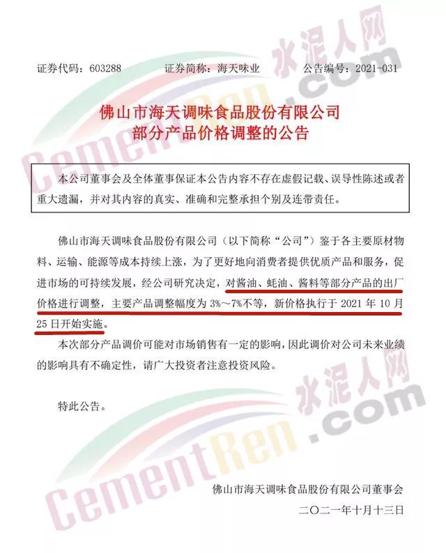 10月12日,海天味業(yè)發(fā)布部分產(chǎn)品價格調(diào)整公告,公告稱對醬油、蠔油、醬料等部分產(chǎn)品的出廠價格進行調(diào)整,調(diào)整幅度為3%~7%不等,新價格執(zhí)行于2021年10月25日開始實施。