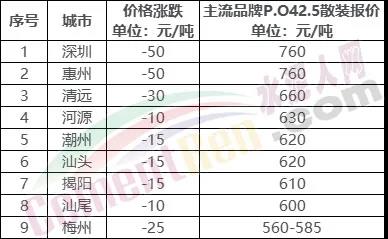 11月4日廣東省部分區(qū)域水泥價格漲跌一覽
