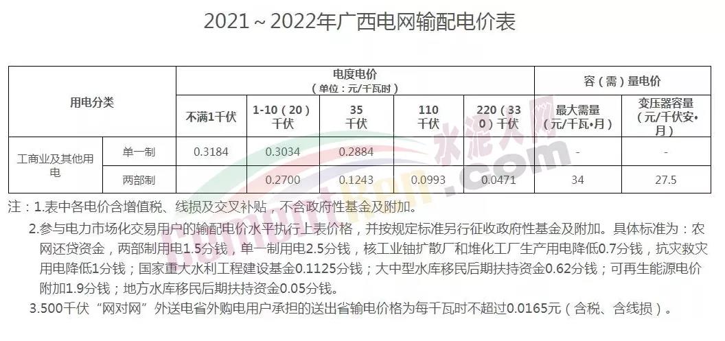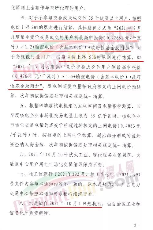 廣西發(fā)布《自治區(qū)工業(yè)和信息化廳關于進一步調整2021年全區(qū)電力市場化交易方案的緊急通知》,在緊急通知中,高耗能企業(yè)電價直接上浮50%進行結算。工商業(yè)及其他用電,執(zhí)行《2021-2022廣西電網輸配電價表》。
