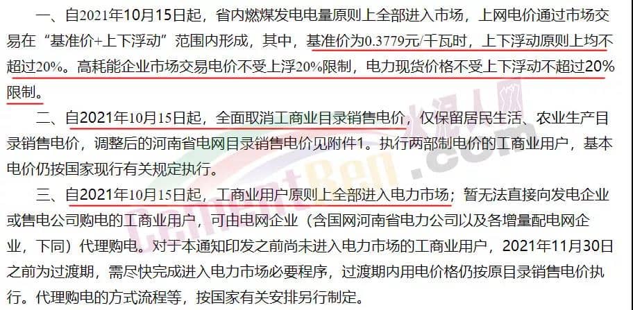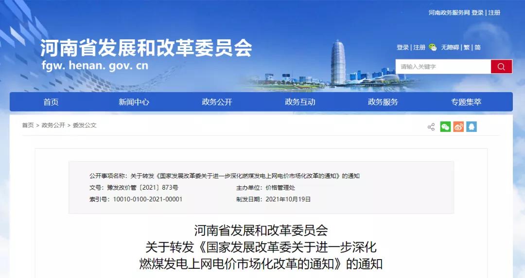 河南省內燃煤發(fā)電電量原則上全部進入市場,上網電價通過市場交易在“基準價+上下浮動”范圍內形成,其中,基準價為0.3779元/千瓦時,上下浮動原則上均不超過20%。高耗能企業(yè)市場交易電價不受上浮20%限制,電力現(xiàn)貨價格不受上下浮動不超過20%限制。自2021年10月15日起,全面取消工商業(yè)目錄銷售電價,僅保留居民生活、農業(yè)生產目錄銷售電價。自2021年10月15日起,工商業(yè)用戶原則上全部進入電力市場。